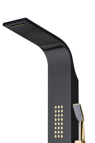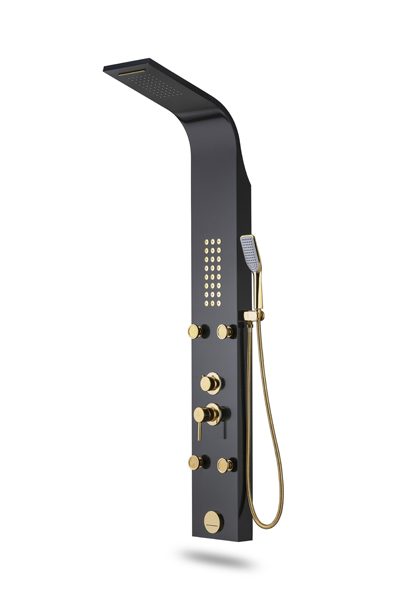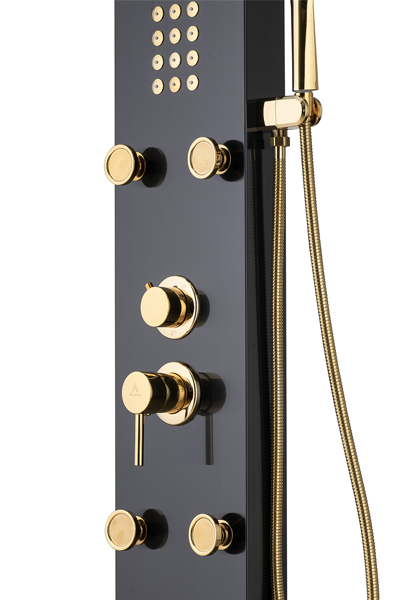 پنل دوش مدل E شرکت آرامان با رنگ مشکی مات و لوازم طلایی ، دارای بدنه استیل ضد زنگ 304 ss (بهترین و مقاوم ترین آلیاژ موجود) و 3 سال ضمانت بدنه است. دارای 5 حالت پرتاب (پاشش) کاربردی به شکل مجزا و لوازم درجه یک می باشد. این پنل دوش جز بهترین و با کیفیت ترین پنل های موجود در بازار جهانی است. مقاومت، زیبایی، کیفیت لوازم و قیمت مناسب مشخصه های اصلی پنل های دوش شرکت آرامان است.
