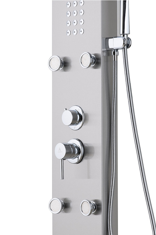 پنل دوش مدل X شرکت آرامان با رنگ کروم مات، دارای بدنه استیل ضد زنگ 304 ss (بهترین و مقاوم ترین آلیاژ موجود) و 3 سال ضمانت بدنه است. دارای 5 حالت پرتاب (پاشش) کاربردی به شکل مجزا و لوازم درجه یک می باشد. این پنل دوش جز بهترین و با کیفیت ترین پنل های موجود در بازار جهانی است. مقاومت، زیبایی، کیفیت لوازم و قیمت مناسب مشخصه های اصلی پنل های دوش شرکت آرامان است.