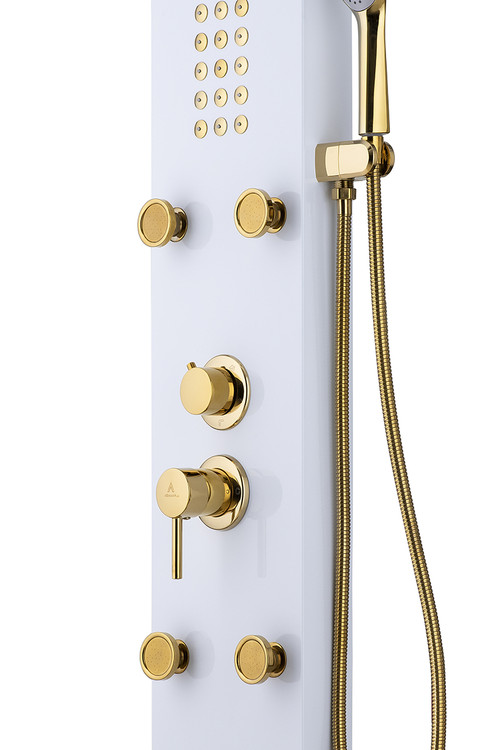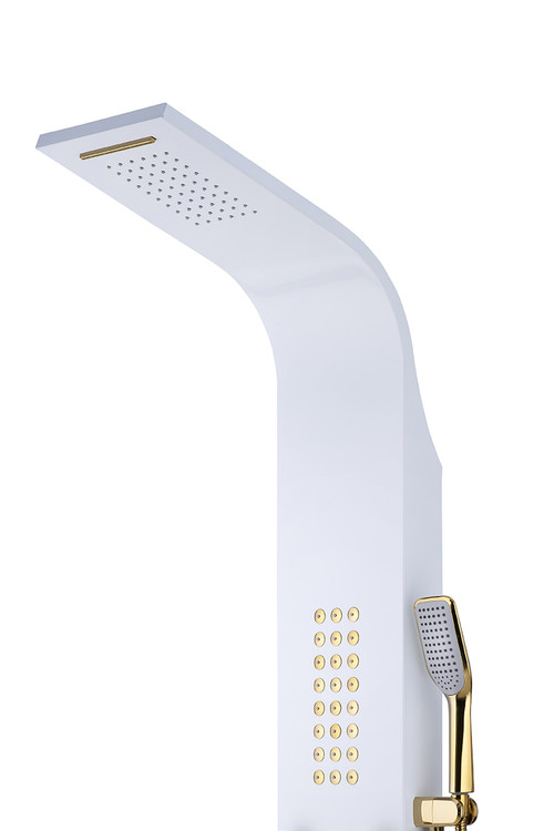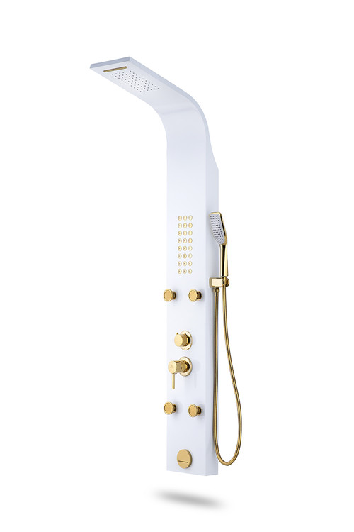 پنل دوش مدل C شرکت آرامان با رنگ سفید الکترواستاتیک و لوازم طلایی، دارای بدنه استیل ضد زنگ 304 ss (بهترین و مقاوم ترین آلیاژ موجود) و 3 سال ضمانت بدنه است. دارای 5 حالت پرتاب (پاشش) کاربردی به شکل مجزا و لوازم درجه یک می باشد. این پنل دوش جز بهترین و با کیفیت ترین پنل های موجود در بازار جهانی است. مقاومت، زیبایی، کیفیت لوازم و قیمت مناسب مشخصه های اصلی پنل های دوش شرکت آرامان است.
