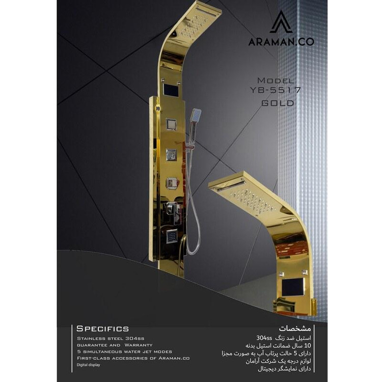 پنل دوش مدل YB-5517 با نمایشگر دیجیتال نمایش دقیق دمای آب، منحصر به فردترین این پنل دوش است. این پنل دوش زیبا دارای بدنه استیل ضد زنگ 304ss (بهترین و مقاوم ترین آلیاژ موجود) می باشد. 5 حالت پاشش آب کاربردی به شکل مجزا، دوش دستی متحرک، لوازم درجه یک و طراحی خاص دیگر ویژگی های این پنل دوش است. نمایشگر هوشمند نشانگر دقیق دمای آب، این پنل را از سایر پنل های موجود در بازار متمایز کرده است.
