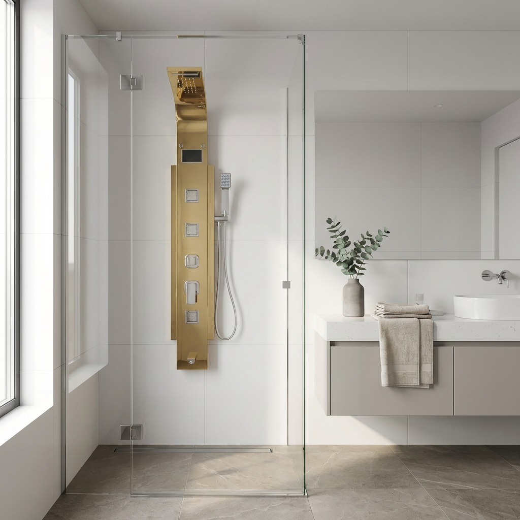 پنل دوش مدل YB-5517 با نمایشگر دیجیتال نمایش دقیق دمای آب، منحصر به فردترین این پنل دوش است. این پنل دوش زیبا دارای بدنه استیل ضد زنگ 304ss (بهترین و مقاوم ترین آلیاژ موجود) می باشد. 5 حالت پاشش آب کاربردی به شکل مجزا، دوش دستی متحرک، لوازم درجه یک و طراحی خاص دیگر ویژگی های این پنل دوش است. نمایشگر هوشمند نشانگر دقیق دمای آب، این پنل را از سایر پنل های موجود در بازار متمایز کرده است.