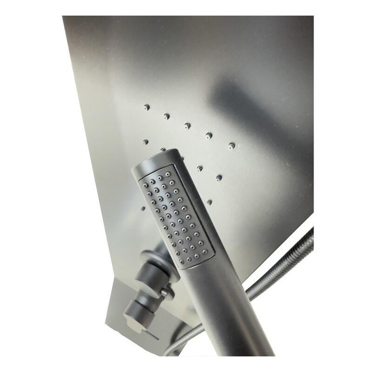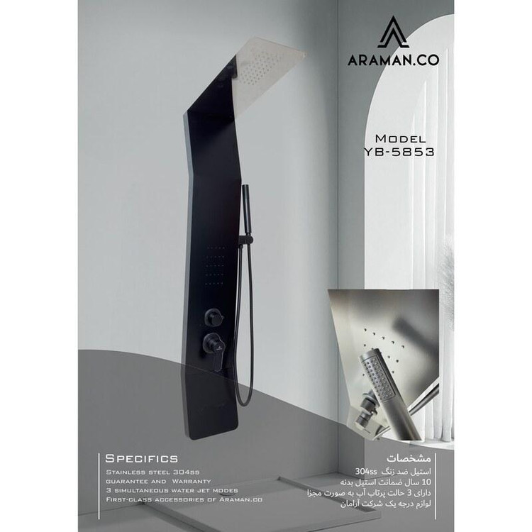 پنل دوش مدل YB-5853 با رنگ مشکی مات، طراحی خاص با خطوط شکسته و دارای بدنه استیل ضد زنگ 304 ss (بهترین و مقاوم ترین آلیاژ موجود)است. دارای 3 حالت پرتاب (پاشش) کاربردی به شکل مجزا و لوازم درجه یک می باشد. این پنل دوش وارداتی جز بهترین و با کیفیت ترین پنل های موجود در بازار جهانی است. مقاومت، زیبایی، کیفیت لوازم مشخصه های اصلی این پنل دوش است.