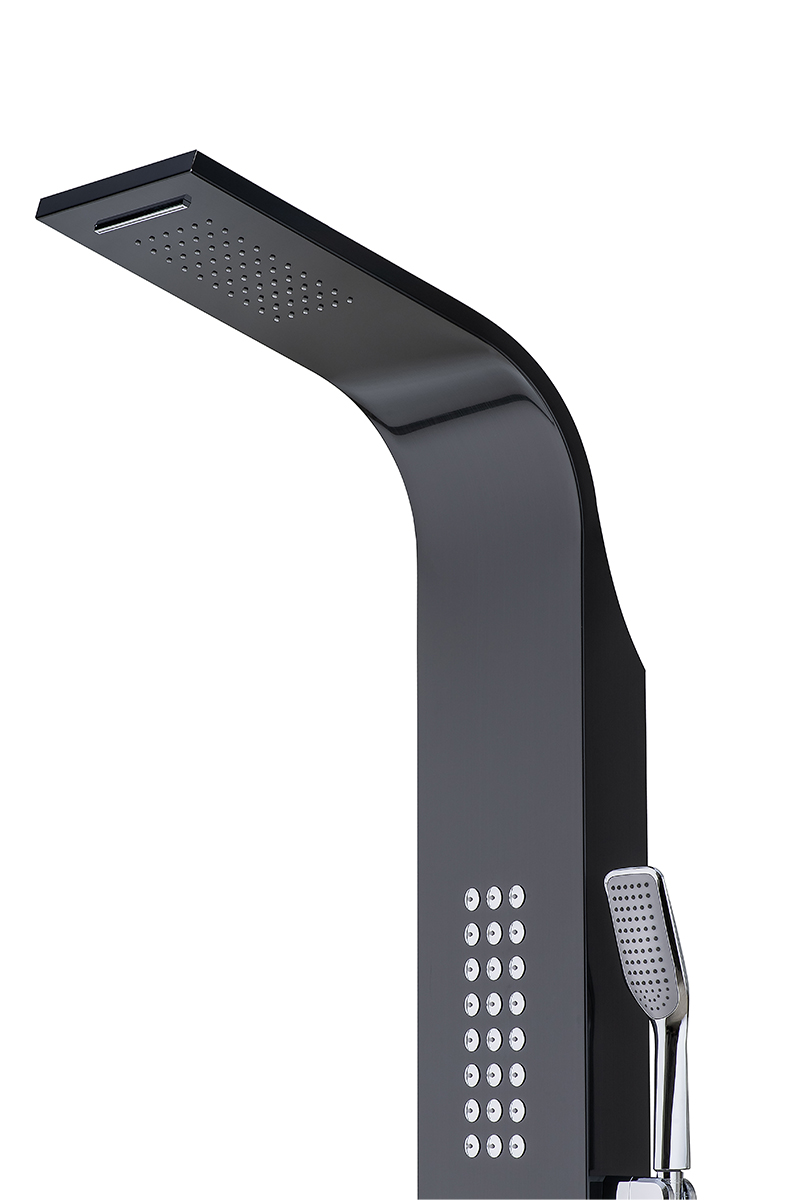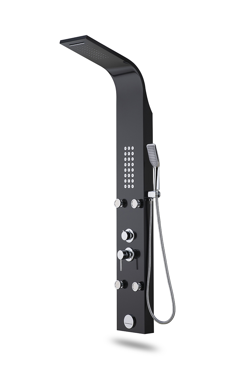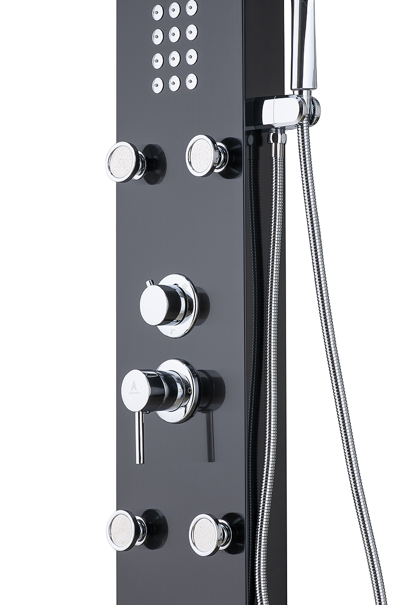 پنل دوش مدل G شرکت آرامان با رنگ مشکی مات و لوازم طلایی ، دارای بدنه استیل ضد زنگ 304 ss (بهترین و مقاوم ترین آلیاژ موجود) و 3 سال ضمانت بدنه است. دارای 5 حالت پرتاب (پاشش) کاربردی به شکل مجزا و لوازم درجه یک می باشد. این پنل دوش جز بهترین و با کیفیت ترین پنل های موجود در بازار جهانی است. مقاومت، زیبایی، کیفیت لوازم و قیمت مناسب مشخصه های اصلی پنل های دوش شرکت آرامان است.